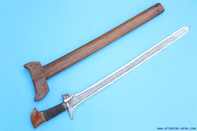 This Kris sword is an early version, probably 19 C, with an earlier blade. The fine blade is forged from twisted steel core, forge welded between high carbon steel edges. Straight blade 24 inches long. The wood grip is bound with thread in a classical binding. Grained wood pommel. Wood scabbard. Total length 26 ½ inches. Very good condition. The very tip of the Ganja is broken. Minor edge nicks. Repaired crack on the scabbard. A rare blade. |