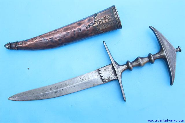 The Jamdhar Katari is a rare form of a dagger in the Indian arsenal. It was popular in North West India in the 16 C. and on. This one is late 19 C. with a very slightly curved blade 7 ½ Inches long. The blade is riveted to a whole steel handle with wide pommel and cross guard. This piece comes with its copper covered steel scabbard, probably a later addition to cover an original damaged steel. Total length (in scabbard) 12 ½ Inches. Good condition. Lightly dented scabbard. |