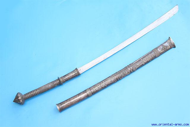 This Dah sword is Thai, late 19 – early 20C. Blade 24 inches long. Beautifully chased silver covered handle with silver wire mesh grip and onion shaped pommel. Filigree silver covered scabbard. Handle is 12 inches long. Total length 37 inches. Very good condition. Traces of grinding on the blade. Minor dents on the handle. The handle of this sword is engraved in Japanese , and a later on added engraving in English that reads: TO MR. BAIRGFATH? THE C.C. OF TENGYUEH, FROM: P. M. TAO BROTHER OF KANAYS 15.2.19?4 . We assume that this dah has passed hands during the second world war or a bit later. |