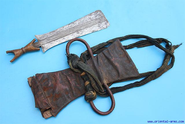 From the grassland of Cameroon in West Africa comes this rare straight sword used by the Tikar people. A 13 ½ inches long, 4 inches wide steel blade. Wood handle. Original hide covered scabbard with carrying belt. Total length 21inches. Good condition. Minor damage to the blade tip on one side. Losses to the scabbard. |
