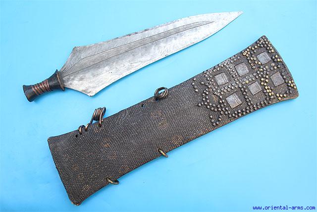 This rare sword is coming from East Central Africa / Tanzania, and from the Bende people. Fine 14 inches blade and nicely engraved. Wood handle bound with copper strip. Very Rare and complete scabbard covered with reptile skin and decorated with steel tacks. Total length 20 inches. Very good condition. |