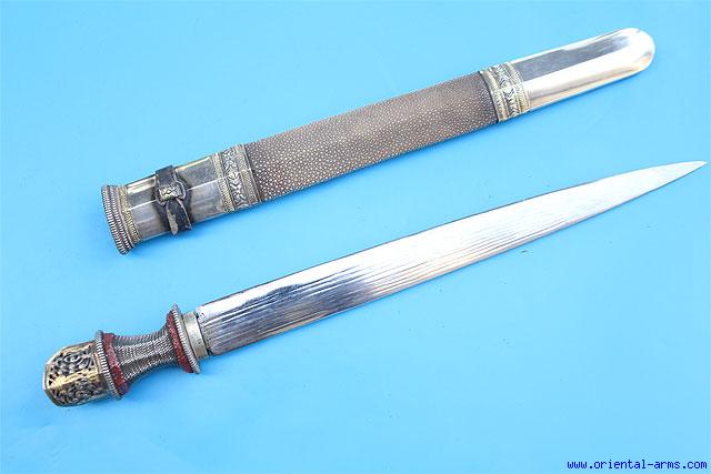 Up for sale is this fine Knife / dagger from Tibet with a strong influence from Bhutan. Heavy blade 13 ¼ inches long forged from folded laminated steel in the structure known as Hairpin pattern. Grip bound with twisted silver wires and with pierced and gilded silver pommel cap. Scabbard bound with natural color sting ray skin and mounted with finely chased silver locket and chape. Total length 17 ¼ inches. Very good condition |