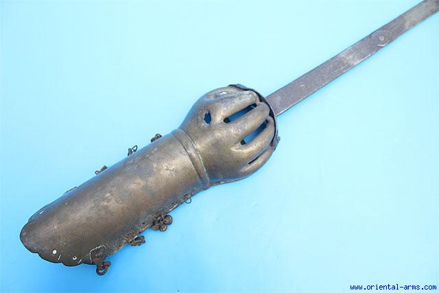 The Pata Indian gauntlet Sword that was evolved from the Kattar push dagger and was in use during several centuries in India. This one is probably early 18 C. with a 37 inches double edge thin and very flexible blade. The hand gauntlet is made of brass in the form of a hand with small bells and rattlers. Total length 49 ½ inches. Good condition. Nicely patinated blade with few minor pitted areas. There are few holes in the handle, the purpose of which is not very clear. The blade was possibly added later but it is early as well. No scabbard. A rare and impressive item.