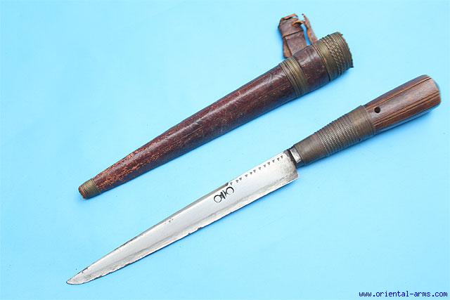 This knife is coming from Southern Algeria, also known as : Khodmi or Bou Saadi Knife. Early 20 C. Very well forged thick blade 7 inches long, marked on both faces. Steel bolster and wood grip bound with steel and twisted brass. Wood scabbard covered with leather and also bound with twisted brass wires. Total length 11 inches. Very good condition. Very minor edge nicks. A very good exemplar of this knife. |