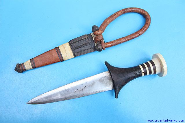 Up for sale is this very good arm dagger from East Africa, Mid – late 20 C. 7 inches well made blade engraved with Arabic inscription. Blackwood and ivory sectors grip with disk shaped pommel. Tooled leather scabbard with the original leather arm band. Total length 11 ½ inches. Very good condition. The grip and pommel disk are cracked but hold very solid. |