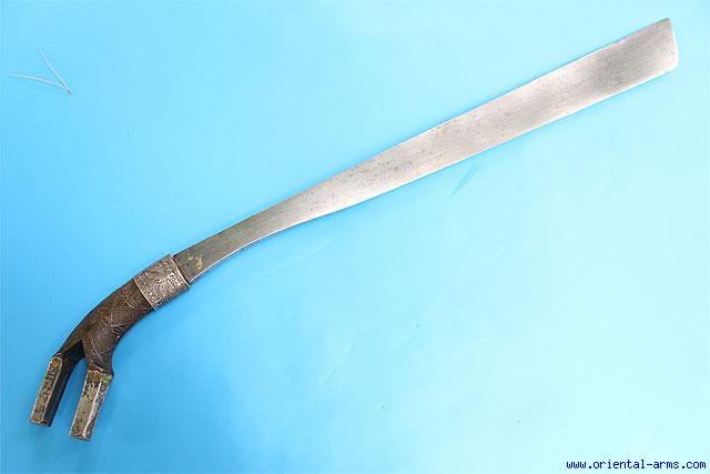 Thus Klewang sword is coming from Sumatra. Unusually heavy blade 20 ½ inches long and 12 mm (almost half inch) thick at the base. The blade is most probably forged from laminated steel. Horn handle finely carved with a forked pommel. Silver collar and silver cover to the pommel arms. The shape of the handle is also known as Hulu Sepampang. Total length 26 inches. Very good condition. |