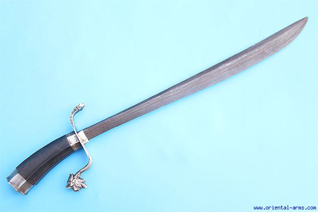 This very fine short sword is coming from Java, Indonesia, mid 19C. The blade is heavy with a ridged spine, forged from very fine pamor steel, 17 inches long. The grip is hollow ground faceted black horn and the mounts and the cross guard are silver. The tip of the guard is styled like a mythological creature. Total length 21 inches. Very good condition. The style of the sword reminds a European hunting sword and may be made to order to a European officer serving in Java. |