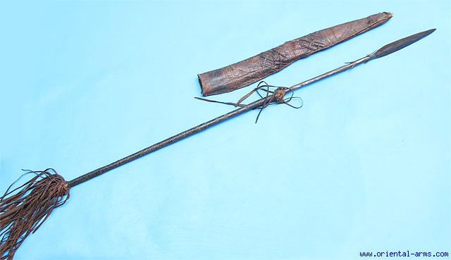 This whole steel spear is coming from North – West Africa, probably from the Tuareg people. Early 20 C. Small 7 inches blade with barbed lower end and decorated with punched dot design. 11 ½ inches flat shaped tail. The haft is covered with leather strips and leather tufts. Length 78 inches. This spear comes with a tooled leather cover for the blade. Very good condition. Losses to the leather tufts and haft cover.