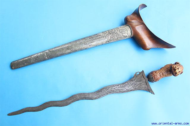 This Keris dagger is coming from Java, late 19 – early 20C. Classical pamor blade 15 inches long. Madura style Ivory handle with a good age patina. Scabbard with partially chased silver cover . Total length 20 inches. Very good condition. All parts original. |