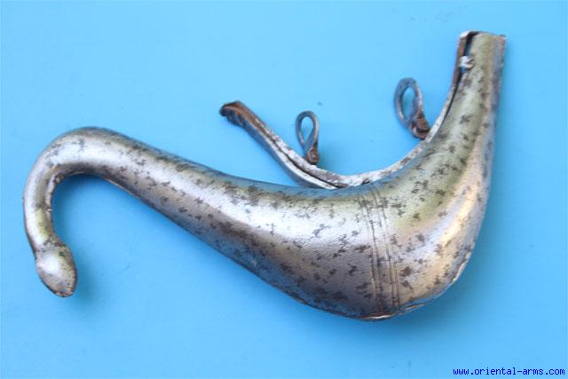 Up for auction is this steel powder flask, Persia, most probably 19C. made entirely steel, in full working order. Total length 7 inches. Very good condition. Solder seams open in few places. Dents on the steel.