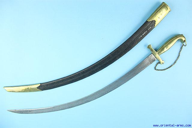 This sword is probably late 19 C, Mameluk style sword, unknown origin, probably western Europe. Single edge, deeply curved blade 27 inches long with an 8 inches back edge. Brass hilt and cross guard with a brass D guard chain. Brass mounted leather covered scabbard. Total length 34 inches. Very good condition. |