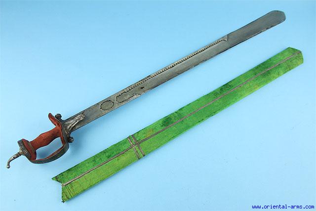 Up for sale is this fine Khanda sword, 18 C. with a 30 1/2 inches long pattern welded steel blade widening to its maximum width of 2 inches just above the tip. The blade has brass inlaid decorations and reinforced with long decorative steel strips on the spine and a shorter one on the ricasso. The basket shape handle is classical Indian beautifully pierced ending with a 2 inches pommel spike. Velvet binding of the grip. Original wood scabbard covered with green velvet (later made). Total length 37 1/2 inches. Very good condition. A fine sword. |