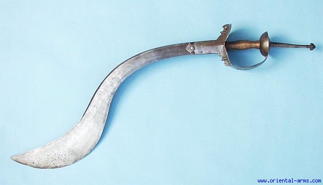 This is a huge Indian sword, mid 19 C. , with a massive deeply re-curving blade 27 inches long and 3 ½ inches wide near the tip. It has a T spine extending to almost two thirds of the blade length and leaving about 10 inches of false edge toward the blade tip. The hilt is of the Khanda type, basket shaped with a long spike protruding from the pommel which is used for two hands maneuvers. The grip is bound with gold colored thread. Good condition. Small pitted spots near the tip and few nicks on the edge. The grip bound is recent. Very unusual find – a prize for the serious collector. |