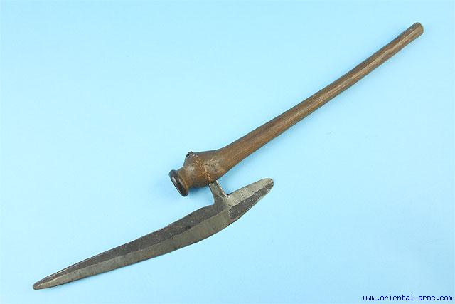 We offer for sale a real, authentic and complete 20 C. axe of the Tonga from Mozambique (but also used by the Shona of Zimbabwe). A 13 1/2 inches long halberd shaped blade, well forged, mounted on hardwood haft. Total length 26 inches. Very good condition. |