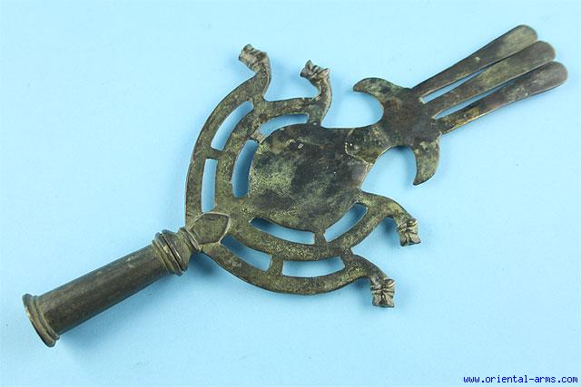 This battle standard, also known as Alam is probably Persian, early 19C. It is cast bronze, 8 inches wide, 15 ½ inches tall.. Very good condition. Untouched age patina on the bronze.