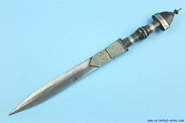 This very good dagger is used by the Tuareg people from the west Sahara. Mid 20 C. but of good quality. Blade 9 inches, flat diamond cross section with 1 inch ricasso. Black wood handle with silver inserts and engraved silver bolsters. Total length 14 inches. Very good condition. |