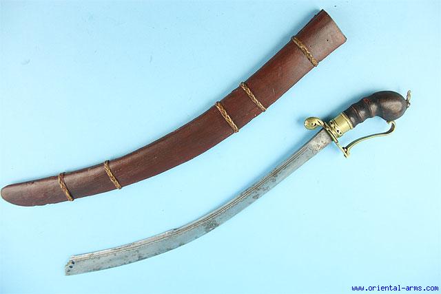 Up for sale is this very good example of the Parang Nabur sword from Kalimantan (Borneo). This saber shaped sword with the D guard is strongly influenced from the naval cutlasses carried by the Dutch sailors, and shows a perfect blend of European with Islamic styles. Up-curving heavy and massive blade 21 inches long, widening to 2 inches wide with a 7 inches back edge, engraved and pierced at the tip. The grip is wood with a heavy brass collar. The cross guard and D guard are brass. Wood scabbard painted dark red with braided rattan bands. Total length 28 ½ inches. Very good condition. Minor losses and repairs on the scabbard. A very good late 19 C. example. |