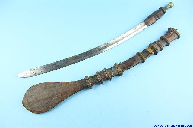 The Manding (Mandingo) are West African people that now live in Gambia, Guinea, Guinea-Bissau, Ivory Coast, and Senegal. Their traditional sword comprises a saber like blade (sometime of French or other European origin), guard less leather grip and scabbard with exquisite leather work. We offer here for sale such a sword. 25 inches long curved heavy blade with a shallow fuller, probably a cut down European military saber blade, leather grip and leather scabbard with leaf shaped widening tip, tooled and decorated. Total length 29 inches. Good condition. Losses and damage to the scabbard. The leather belt strips and tassels are missing. |