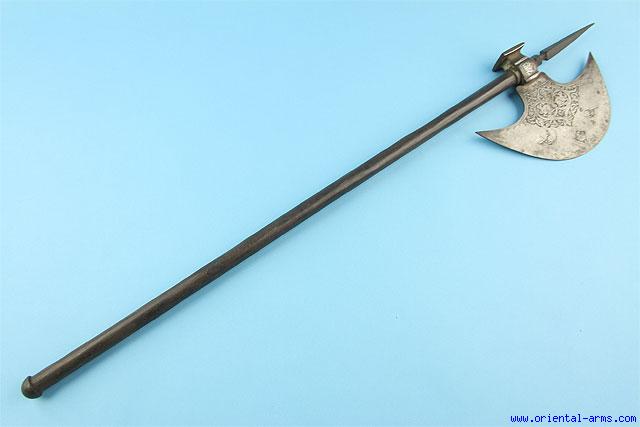 This battle axe is Indian, late 19C. Finely chiseled lunette shaped blade 9 inches long and 5 inches wide. Steel haft with 5 inches long pike at the top. Total length 33 ½ inches. Very good condition