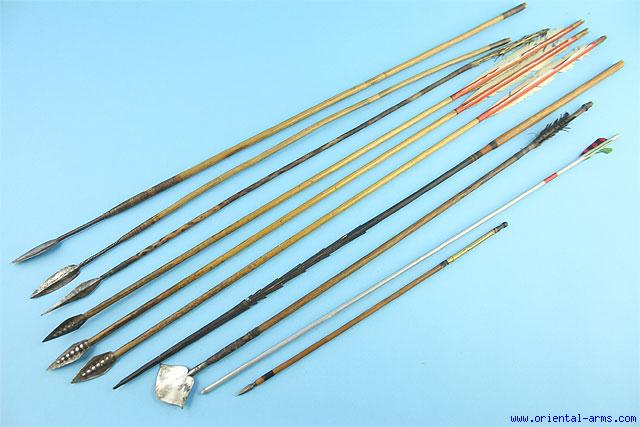 This lot includes 10 arrows, various origin and use: Hunting arrows, Indian and African, wood arrow from Papua New Guinea and modern sporting arrows. 16 – 37 inches long. Good condition.