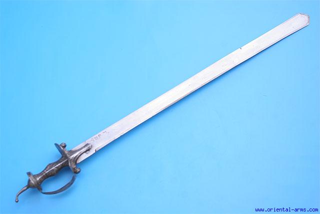 This Fine sword comes from India. The blade 31 inches long deadly sharp, with a 9 inches back edge, Marked with a maker mark (Just below the langet) and inscribed. The basket hilt is steel, beautifully pierced all around and the grip is finely chiseled. Total length 38 inches. Very good condition. Minor edge nicks. No scabbard. A fine sword. |