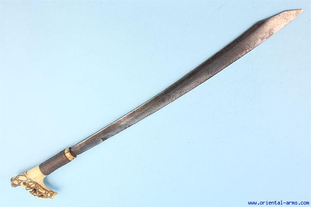 The MANDAU (sometimes also called “Parang Ihlang”) is the traditional sword of the Dyak tribes of Borneo. It was primarily associated with the Head Hunting tradition of the Dyaks but also used as a general-purpose jungle knife. It has a slightly curved single edge blade with a convex / concave cross section, allowing efficient strikes only along a circular line from top down. It is a fearsome and very efficient weapon in the experienced hand, and was really used for head hunting. This specific item has a 17 ˝ inches heavy blade. The pommel is of the “L” shape. It is carved from bone in a beautiful and intricate design and bound with twisted rattan strips. Very good condition. No scabbard. |