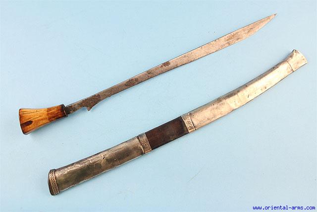 One of the rarest form of swords from Sumatra is this sword of the Toba Batak people, also known as Piso Gading. The single edge slender blade is 15 inches long. The fluted handle is cut from a massive piece of elephant ivory. Wood scabbard bound with silver mounts. Very good condition. Very good age patina of good deep color on the ivory handle. Few patches of pitted areas on the blade and minor dents and losses to the silver cover. For a similar swords see also: Albert G. Van Zonneveld Traditional Weapons of the Indonesian Archipelago Fig 421 P. 107, and Achim Sibeth The Batak- Peoples of the Island of Sumatra Fig 212 P. 163. A rare sword. |