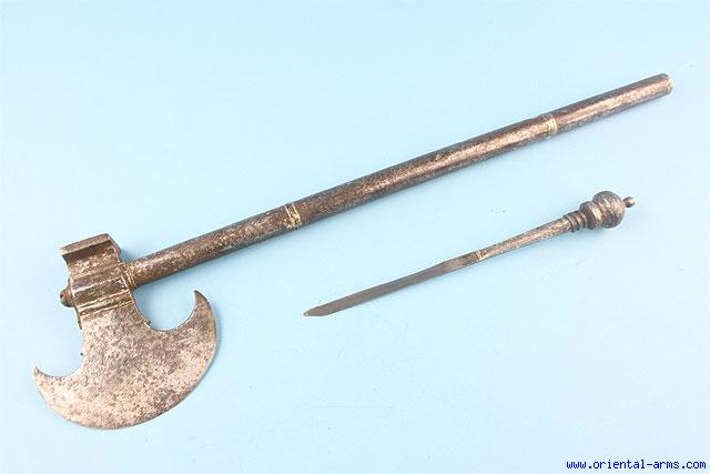 This battle Axe is Indian late 18 C. or earlier. The crescent shape blade is 5 inches long . The haft is steel 22 inches long. The lower tip of the haft opens to reveal a 5 inches slim blade. Good condition. Heavily patinated blade and handle with traces of engraving. |