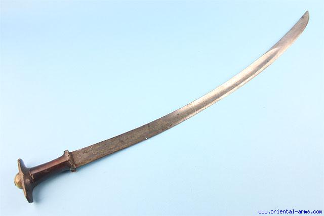 The GURADE is the Ethiopian saber. They usually have European imported blades, mounted with typical Ethiopian hilt. This specific one has a wide, 32 inches long thick blade of European origin, finely etched and marked on the spine. The hilt is carved from two sectors of rhino horn and the pommel cap is finely engraved gilded copper dome. Total length 37 inches. Very good condition. Small chips on the handle. No scabbard. |