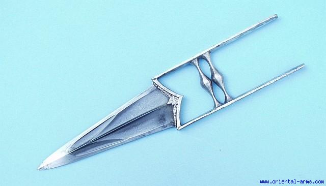 This is a quality 18 Century Armor piercing Katar push dagger, forged from very nice Persian wootz (Damascus) steel. The edges are left unetched and polished in order to enhance the wootz pattern. The blade is 8 inches long, 2 ½ inches wide. The two cross bars provide the holding and the 7 inches side bars protects the fist from a side sword hit. All hilt parts are covered with very thin silver foil. Very good condition. Excellent and clear wootz pattern of very high contrast. Few very minor pitted spots. |