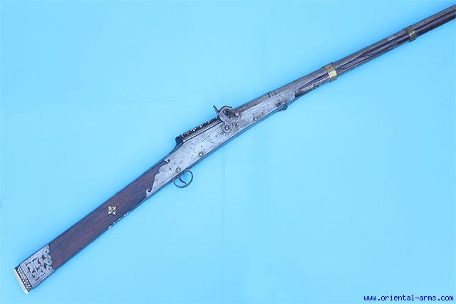 Here is a nice old Indian gun with percussion Lock system. The 45 inches barrel has Indian inscriptions. Wood body with beautiful pierced steel mounts, and some ivory dots inlaid decorations. Total length 64 inches. Nice old Gun for very low price.
