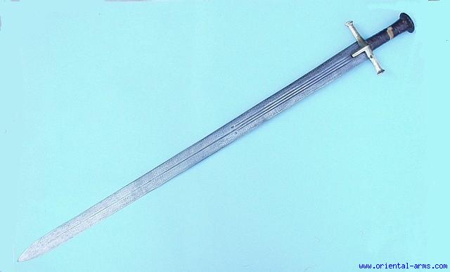 A very good and old Kaskara sword from Sudan Area. The blade is Extremely long and wide, 37 ½ inches long and more than 2 inches wide at its top, of very good quality steel, stamped with two crescent stamps probably of a German origin trade blade. The blade is entierly etched with inscription style decoration. The Cross guard is brass and th grip is wood bound with leather strips (partially damaged). No scabbard. Total length 43 inches. Blade in excellent condition. One langet (down pointing protrusion of the cross guard) is missing. |