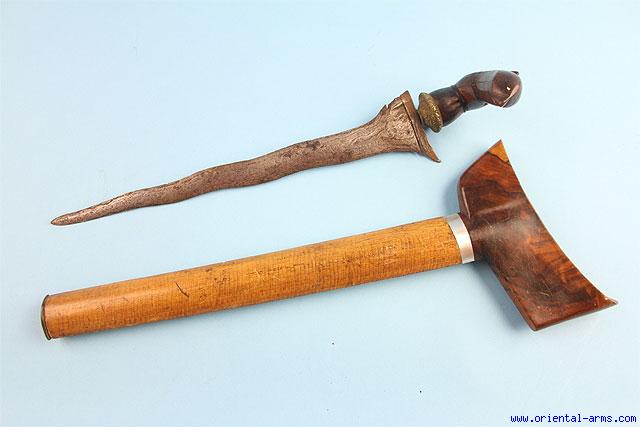 This Bugis Keris Dagger has a good wavy blade 13 inches long, with clear pamor structure. The mendak is chased brass. The hilt is carved from beautifully grained wood in a classical Sulawezi style. The scabbard is grained wood. Total length 19 inches. Very good condition. |