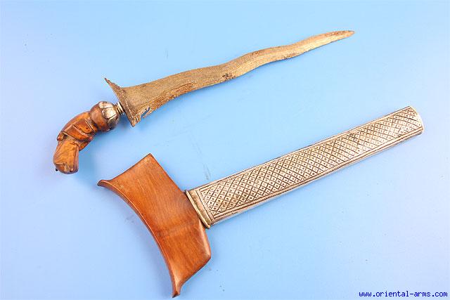 This miniature bugis keris has all the characteristics of a full size Bugis: Pamor blade 7 ½ inches long, silver covered scabbard, wood grip with silver medak. Total length 10 ½ inches. Very good condition. Age crack on the handle but holds solid. Early – mid 20C. |