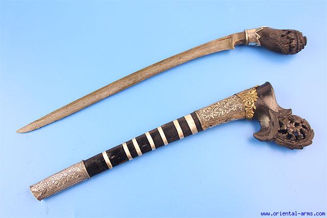 This Sewar knife is from Sumatra late 19C. It has a rather long pamor blade is 12 ½ inches, slightly down curving, single edged with wide fuller at the base. Carved dark Horn handle with silver collar. Dark wood scabbard with carved horn top and chased silver mounts and silver bands. Total length 17 inches. Good condition chape with a small repair.