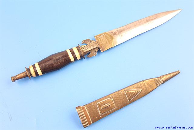 This very good dagger is used by the coming from west Africa. Mid 20 C. but of good quality. Blade 5 ½ inches, flat diamond cross section with 1 inch ricasso. Black wood and bone handle and brass / copper scabbard. Total length 11 inches. Very good condition. A similar dagger in the British Museum is described as coming from the Bissagos ( Bijagos) Islands, a group of islands off the coast of Guinea – Bissau, but the attribution to these islands is questionable. |