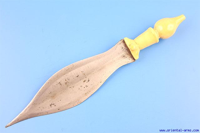 The swords and daggers of the Baule tribe were very rare and sought after by collectors of African weapon / tribal arts. The Baule people reside in Ivory Coast and Neighboring Ghana. We think that the dagger offered here is Baule, leaf shaped, very well forged 8 inches long and 2 ½ inches wide. The handle is finely carved ivory with a cross shaped base. Total length 12 inches. Very good condition. Very good age patina on the handle. No scabbard. |