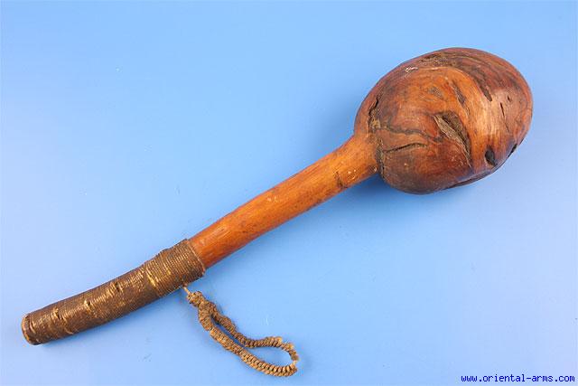 The Ula or Ulu is a throwing club from the Fiji Islands. It is carved from the root stem of a local bush, and it is extremely hard. The head is of ball shape 4 x 5 inches and the handle is 11 inches long with nice thread binding at the tip. Total length 15 inches. Good condition. Age crack on the head where the ball join the handle. An early 20th C. vintage item. |