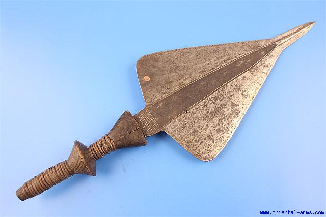 Up for sale is this large and good fighting sword of the Saka people residing in Central Zaire. Very well forged triangular shaped blade, 14 inches long, 7 ½ inches wide, with central blackened area and a round copper insert. Wood handle bound with copper strips. Very good condition. Very good original patina on the blade. Minor age crack on the wood grip. Wide and impressive sword. Early 20C. |