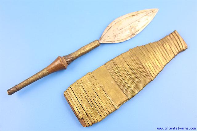 This is a very nice and elegant African dagger. We are not sure about the origin probably from Zaire. It has a good quality hand forged 5 inches leaf shaped blade. Wood scabbard covered with brass wire of different thickness, long wood hilt covered with brass wire as well. Total length 15 inches. Very good condition. Late 19C.