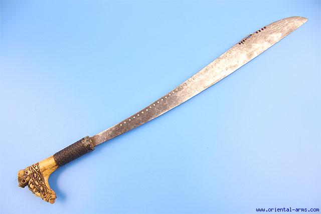 Although similar, this is NOT a Mandau. It is better known as Jimpul and it is used in the same regions and same people who uses the Mandau sword. Not like in Mandau, the blade is curved upward and has a symmetrical cross section. The hilt however reminds that of the Mandau. Both the Jimpul and the Mandau are coming from Kalimantan (Borneo) and both are associated with the head hunting tradition of the Dayak. This Jimpul has a heavy, up curving, 19 inches blade with silver inlay inserts (few missing). The handle is antler elaborately carved, bounded with rattan. Total length 24 1/2 inches. few pitted spots near the tip. |