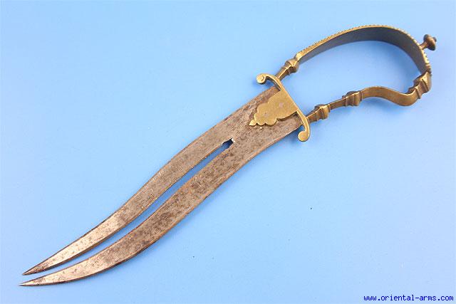 This dagger is a ‘BICHWA’ meaning: ‘The Scorpion Sting’. It is Indian. Mid to late 19 Century. This example has unusual double blade. The blades are double edged, re-curving, 7 inches long. The grip is decorated brass, shaped like a knuckle duster. Total length 11 inches. Perfect condition.