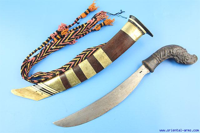 This machete like short heavy knife is a Bendo from Java, Indonesia. Early 20 C. The heavy marked blade is 10 ½ inches long slightly up curving. Black painted carved hardwood handle. Wood scabbard bound with brass bands and mouth and tip with horn and bone alternating layers . Total length 20 ½ inches. Very good condition. |