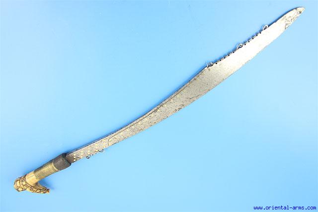 Although similar, this is NOT a Mandau. It is better known as Jimpul and it is used in the same regions and same people who uses the Mandau sword. Not like in Mandau, the blade is curved upward and has a symmetrical cross section. The hilt however reminds that of the Mandau. Both the Jimpul and the Mandau are coming from Kalimantan (Borneo) and both are associated with the head hunting tradition of the Dayak. This Jimpul has a heavy, up curving, 21 inches blade with brass inserts. The handle is antler elaborately carved, bounded with twisted brass wires. Total length 27 inches. Few pitted spots near the tip. |
