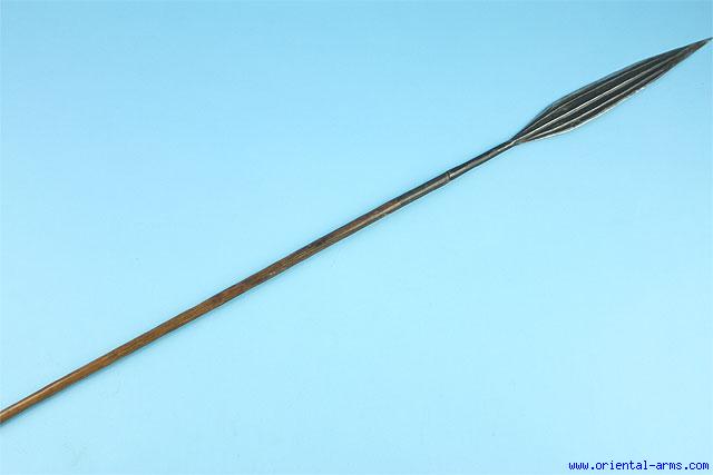 This spear is most probably from the Saka people. 12 inches very well forged, fullered blade with 3 ½ inches socket, mounted on a wood haft. Total length 57 inches. Very good condition. Early 20C. Haft may be later