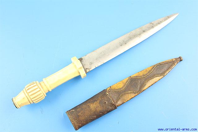 The swords and daggers of the Baule tribe were very rare and sought after by collectors of African weapon / tribal arts. The Baule people reside in Ivory Coast and Neighboring Ghana. We think that the fine dagger offered here is Baule. Very well forged blade 8 inches long.. The handle is finely carved ivory with a cross shaped base. Tooled leather original scabbard. Total length 13 inches. Very good condition. Very good age patina on the handle. |
