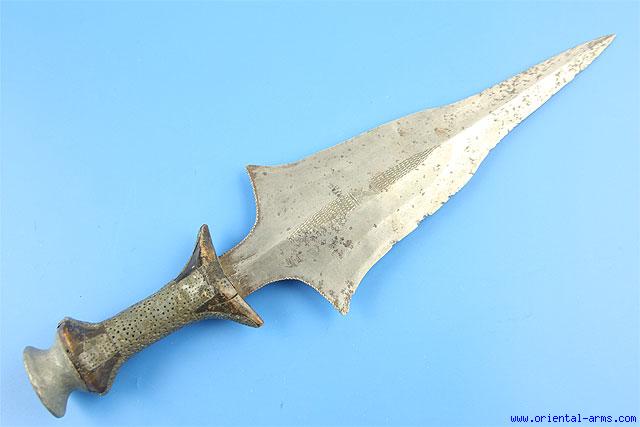 Up for sale is this rare Dagger / short sword of the B>Tetela people residing in the heart of the rain forests. Finely forged 11 ½ inches blade delicately incised with lines and geometrical design. Wood grip covered with gray colored metal, may be pewter, and a heavy metal pommel. Total length 16 ½ inches. Very good condition. Good age patina on the handle and the pommel. Minor edge nicks. No scabbard. |