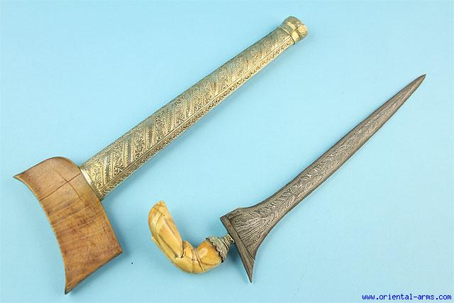 This very fine Keris is early – mid 20C. with a straight 14 inches fine pamor blade. Ivory grip of classical form with copper mendak. Finely chased gilded silver scabbard cover. Total length 18 inches. Very good plus condition.