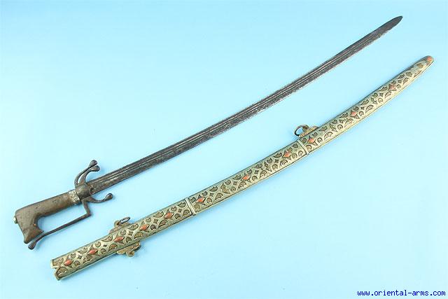 This long Nimcha sword employ an early blade, probably early 19C. of European origin. Blade length 32 inches. Classical handle with steel D guard and triple down curving langets. Horn handle. Pierced white metal over brass scabbard set with corals and with three big carrying rings. The back of the scabbard is engraved with Arabic letters. Total length 42 ½ inches. Very good condition. Well patinated blade. The scabbard is later, mid 20C. |