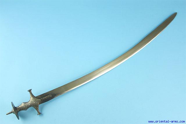 This very good Tulwar sword has a heavy 31 inches blade, forged from very good Indian Wootz (Crystalline Damascus) steel. The blade is welded from two parts in the style known as Scarf Welding, a technique common to good Indian blades. Classical silver inlaid steel handle. Total length 35 1/2 inches. Original polish and etching. Very good condition. No scabbard. 19c.